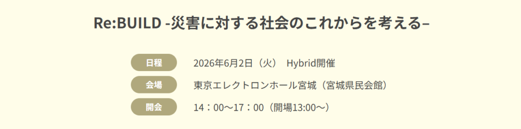 2026年の開催地は宮城県。「Re:BUILD -災害に対する社会のこれからを考える–」をテーマに、災害に向き合う社会の「これから」について、ともに学び、考えます。