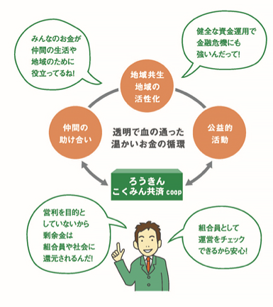労金、こくみん共済coop <全労済>などの労働者福祉事業に結集することによって非営利の事業が拡大し、それにより、くらしが向上し、会員組織以外の地域や市民にまで福祉の幅を広げていくこともできるのです。- (2)協同組合へ期待される役割