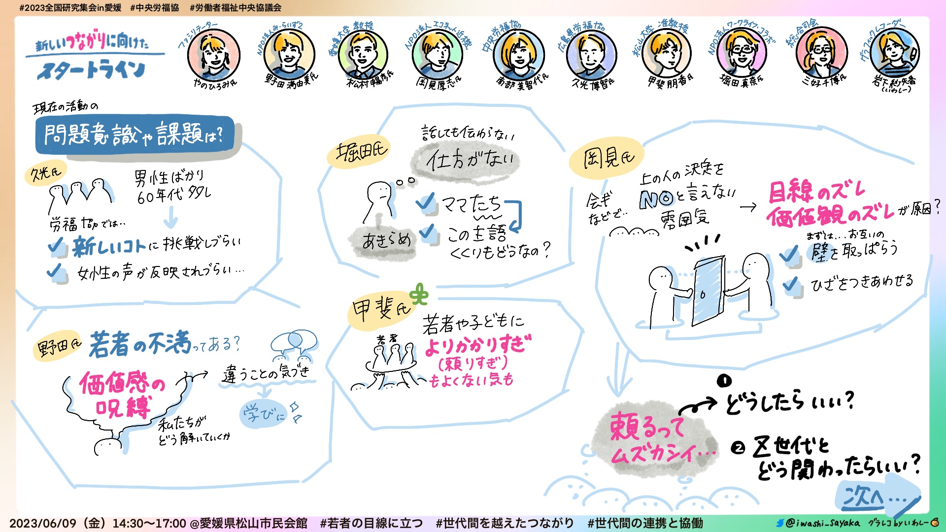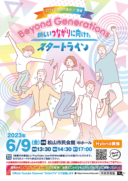 「結果重視からプロセス重視へ」、「集団から個へ」、「画一性から多様性へ」、昭和から平成、令和へと時代が変わりゆく中で、私たちの社会を取り巻く「価値観」は大きく変化した。そして令和の幕開けとともに訪れたパンデミックはDXを急速に進展させ、また2025年にはデジタルネイティブやソーシャルネイティブと言われるZ世代が生産年齢人口の半数を占める時代が到来する。私たちはいま加速度的に変化を続ける時代に生きている。 2030年の国連SDGsの達成、労福協の2030年ビジョンの実現に向け、私たちは新しい視点を持ち、今まで接点のなかった層へとつながりを広げていく必要がある。2022静岡では「若者を知る、若者の目線に立って」をキーワードに、若者たちの持つ感性、価値観、考え方や生き方にふれた。2023年はこの学びをさらに深堀りして若者への解像度を上げていくとともに、同じ時代を生きている者同士が世代を超えてつながり合い、社会や地域の課題に取り組む実践者たちをゲストに招き、若者を基軸にさらに世代間の連携・協同の可能性について考察する。