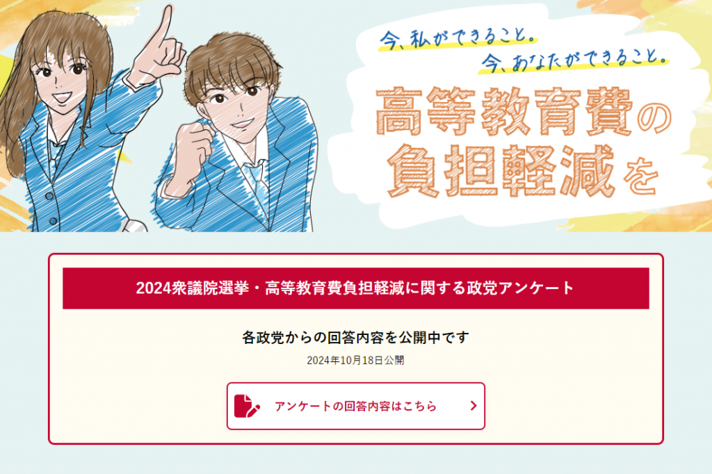 すべての人が学べる社会へ 高等教育費負担軽減プロジェクトが「2024衆議院選挙・高等教育費負担軽減に関する政党アンケート」の結果を公表