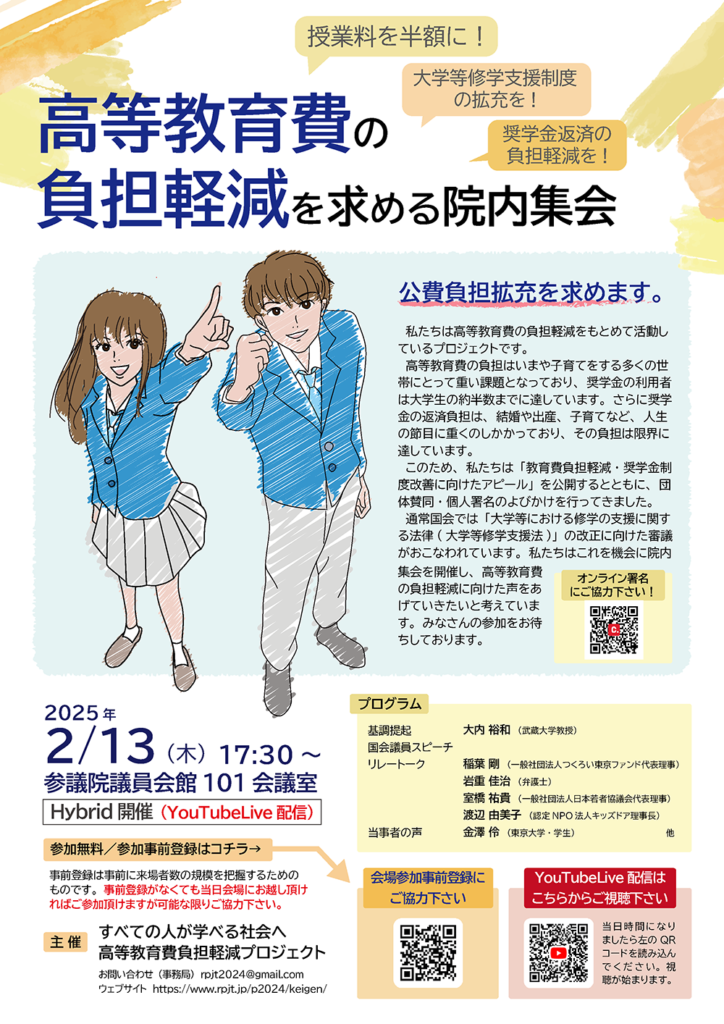 すべての人が学べる社会へ 高等教育費負担軽減プロジェクトが2月13日に院内集会を開催します!