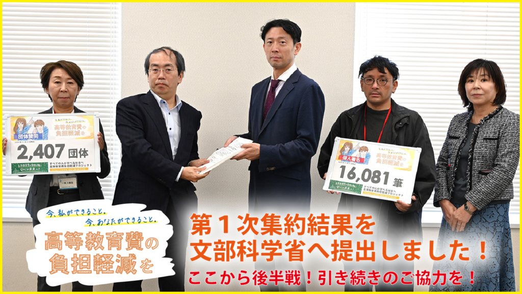すべての人が学べる社会へ 高等教育費負担軽減プロジェクトが団体賛同2,407団体、個人署名16,081筆を第一次集約分として文部科学省へ提出、要請を実施