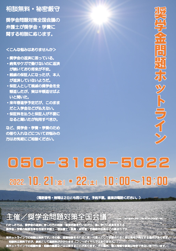 奨学金問題対策全国会議より:10月21・22日「奨学金問題ホットライン」のお知らせ