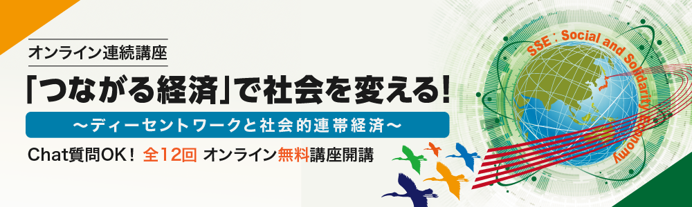 本日午前10時より、オンライン連続講座『「つながる経済」で社会を変える!~ディーセントワークと社会的連帯経済~』の特設ウェブページをオープンし、受講申し込みの受付をスタートしました。いま、国際的に注目されている SSE=Social and Solidarity Economy(社会的連帯経済)について、ゼロから無料で学べるオンライン講座です。学生の皆さん、一般の皆さんも含めて、全国どこからでもどなたでも受講頂けます。社会的課題の解決や、協同組合・労働組合・NPO・市民団体・社会的企業などの「つながり」に関心がある方、ぜひご参加ください。