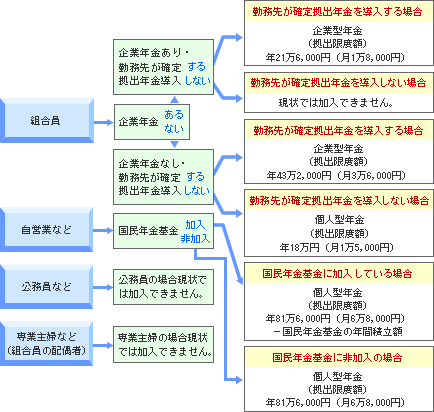 「企業型年金」に加入できるのは、確定拠出年金を導入している会社の組合員で、「個人型年金」に加入することができるのは、国民年金の第1号被保険者と企業年金がない会社にお勤めの60歳未満の組合員の方々です。