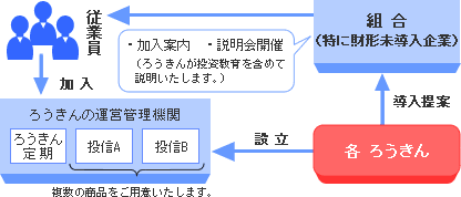 また、「ろうきん」としても、「個人型年金」(Q11参照)に対応するため運営管理機関を設立し、加入受付をはじめ、「個人型年金」にかかわる情報提供や投資教育に取り組みます。また、運用商品として、定期預金と投資信託をご提供します。