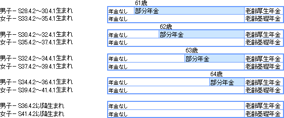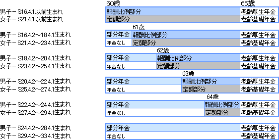 60歳から受けられる特別支給の老齢厚生年金は、S16年(女子21年)4月2日以降生まれの人から生年月日に応じて段階的に報酬比例部分相当の老齢厚生年金(部分年金)へと切り替えられ、S24年(女子29年)4月2日以降生まれの人で、切り替えが完了する。さらに、S28年(女子33年)4月2日以降生まれの人は、報酬比例部分相当の老齢厚生年金(部分年金)の支給開始年齢も段階的に引上げられ、S36年(女子41年)4月2日以降生まれの人は、60歳台前半の老齢厚生年金はなくなる。