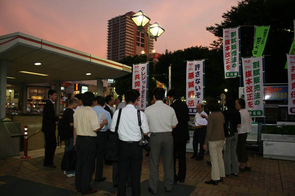 埼玉労福協は9月13日の夕方、浦和駅西口で埼玉弁護士会や埼玉司法書士会、消費生活相談員の人たちと連携し、リフォーム詐欺をはじめとする訪問販売による悪質商法を追放し、安心して利用できるクレジット制度をめざした割賦販売法改正のための街頭宣伝と署名活動を行いました。