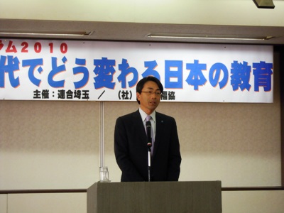 社団法人埼玉県労福協と連合埼玉の共催により「教育フォーラム2010」を開催しました。このフォーラムは、埼玉県の教育週間(11月1日~7日)に合わせて毎年開催するもので、本年度は、昨年8月の政権交代を受けて、「政権交代でどう変わる日本の教育(仮第)」をテーマとしました。