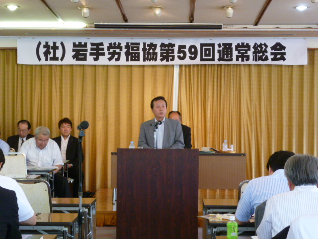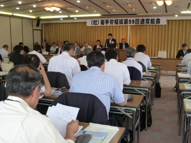 (社)岩手労福協は、6月18日(月)第59回通常総会を岩手労働福祉会館5階「いしわり」において16時から開催しました。代議員47名(出席47名・委任10名)や来賓、理事会役員など68名が出席して2011年度事業報告と会計報告等、すべての議案を満場一致で可決承認されました。