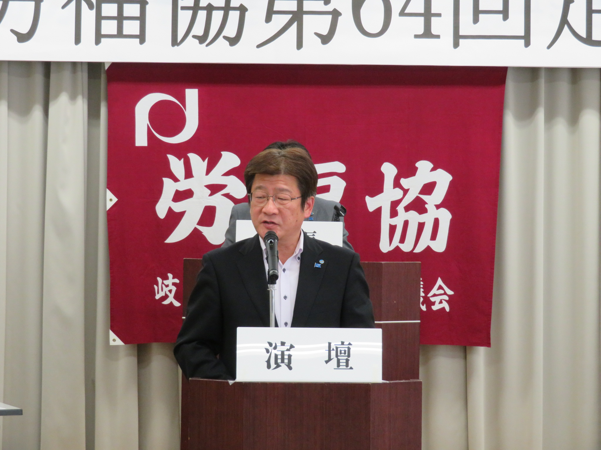 引き続き、来費として、岐阜県の大城戸労働雇用課長、岐阜市の山口商工観光部長、の祝辞を受け、事業団体から東海労働金庫舟口専務理事・全労済岐阜推進本部豊田本部長を紹介しました。