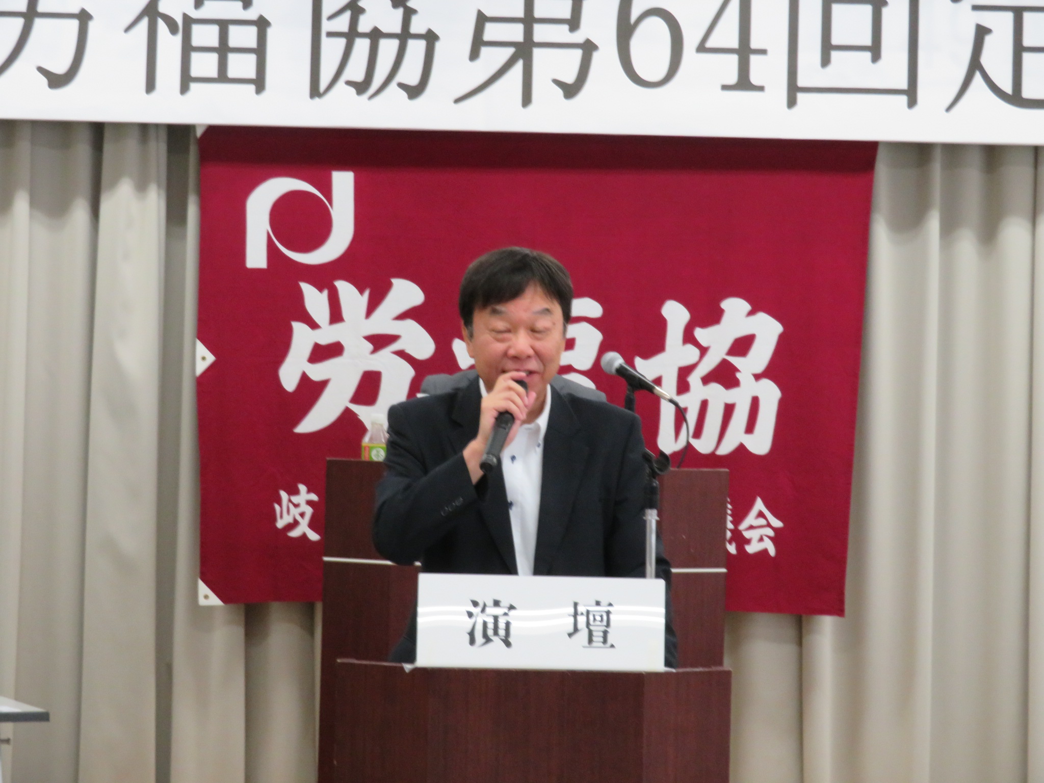 冒頭、田会長より、1.働く仲間の福祉向上を旗印に老後も含めた生涯に通じた福祉社会実現を目指す。2.岐阜労福協65周年記念事業について北海道視察研修および県内施設への寄付の実施。3.被災者に寄り添う支援活動の実施について挨拶しました。