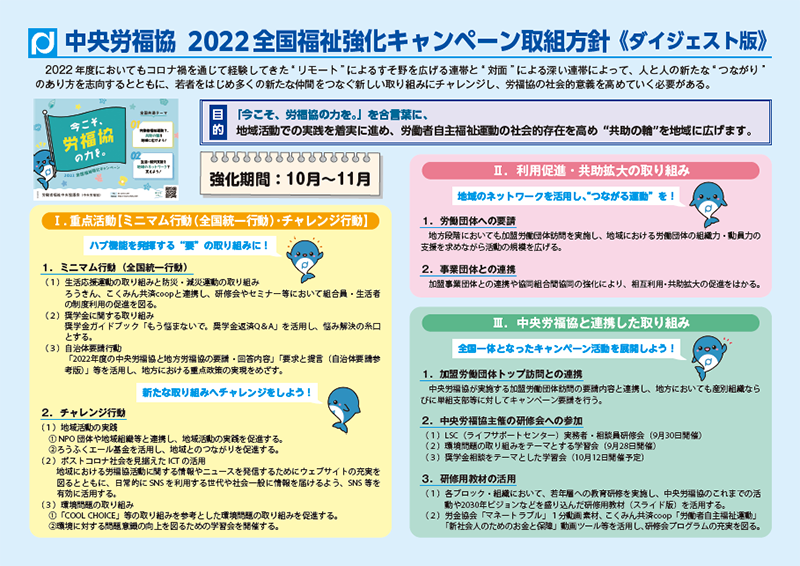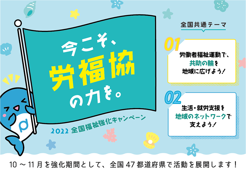 「全国福祉強化キャンペーン」は、毎年全国47都道府県の労福協が一斉に取り組む「福祉強化」を目指すキャンペーンです。10~11月を取り組み強化期間として、「今こそ、労福協の力を。」を合言葉に、活動を展開します。