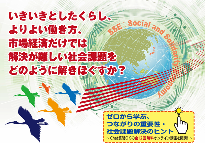 今回、この「SSE」をゼロから学べる全12回のオンラインセミナーを開講することとなりました。この講座は中央労福協加盟団体に限らず、非営利の活動や事業に興味のある学生の方、あるいはNPO・NGOや市民団体などで現在ご活躍中の方なども含め、広く一般の皆さんにも受講して頂けるものとなっています。