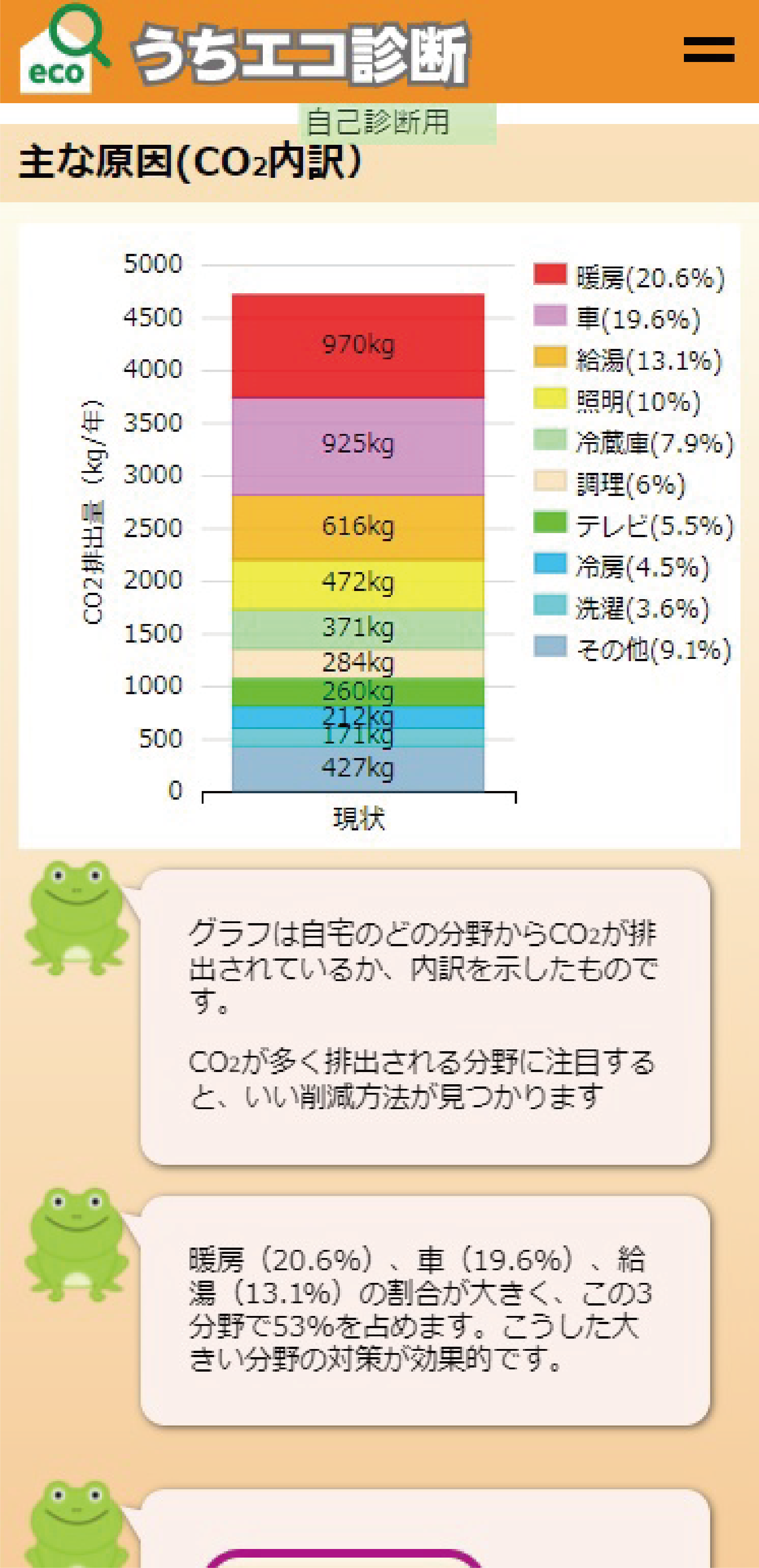 自分の生活のCO2排出量を簡単に算出でき、削減に向けた具体的な対策の提案や光熱費をどの程度削減できるか等を見えることができます。
