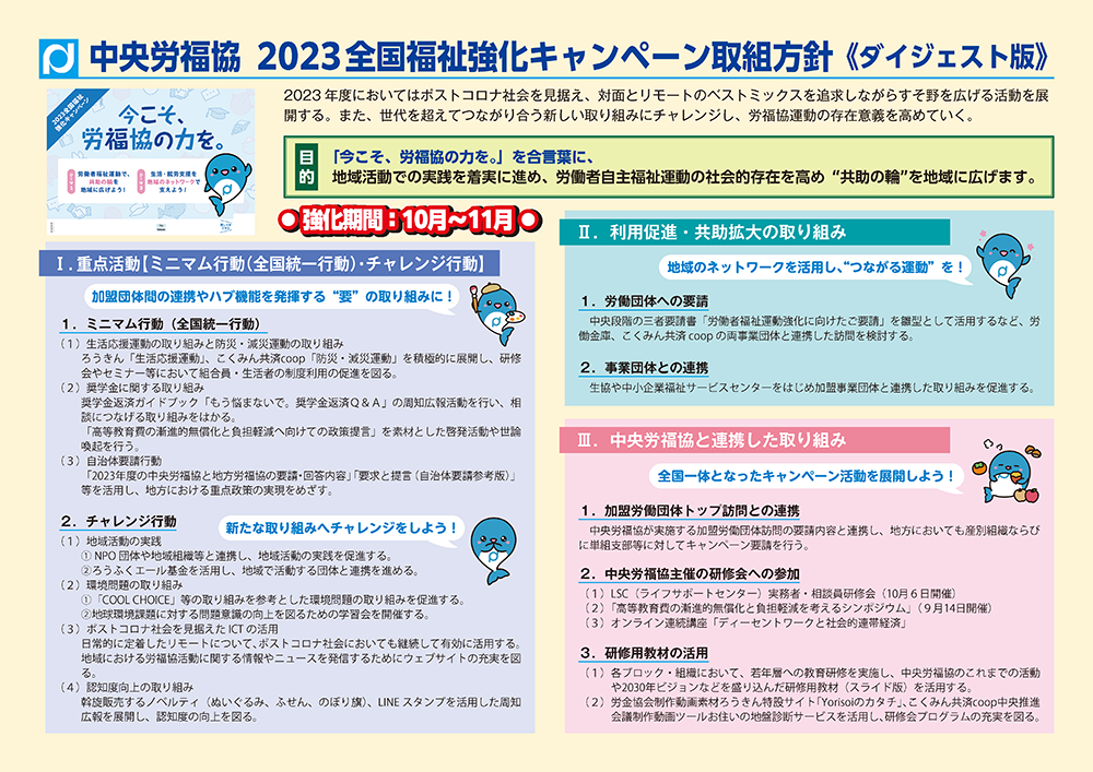 「全国福祉強化キャンペーン」は、毎年全国47都道府県の労福協が一斉に取り組む「福祉強化」を目指すキャンペーンです。10~11月を取り組み強化期間として活動を展開します。