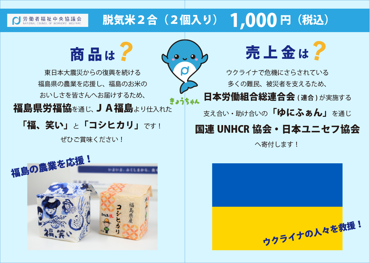 お米は、福島県労福協を通じて、JA福島(JAパールライン福島株式会社)から仕入れを行い、福島県のブランド米である「福、笑い」と「福島県産コシヒカリ」の2つの銘柄を2合(300g)ずつ真空パックに詰めたセットを販売します。