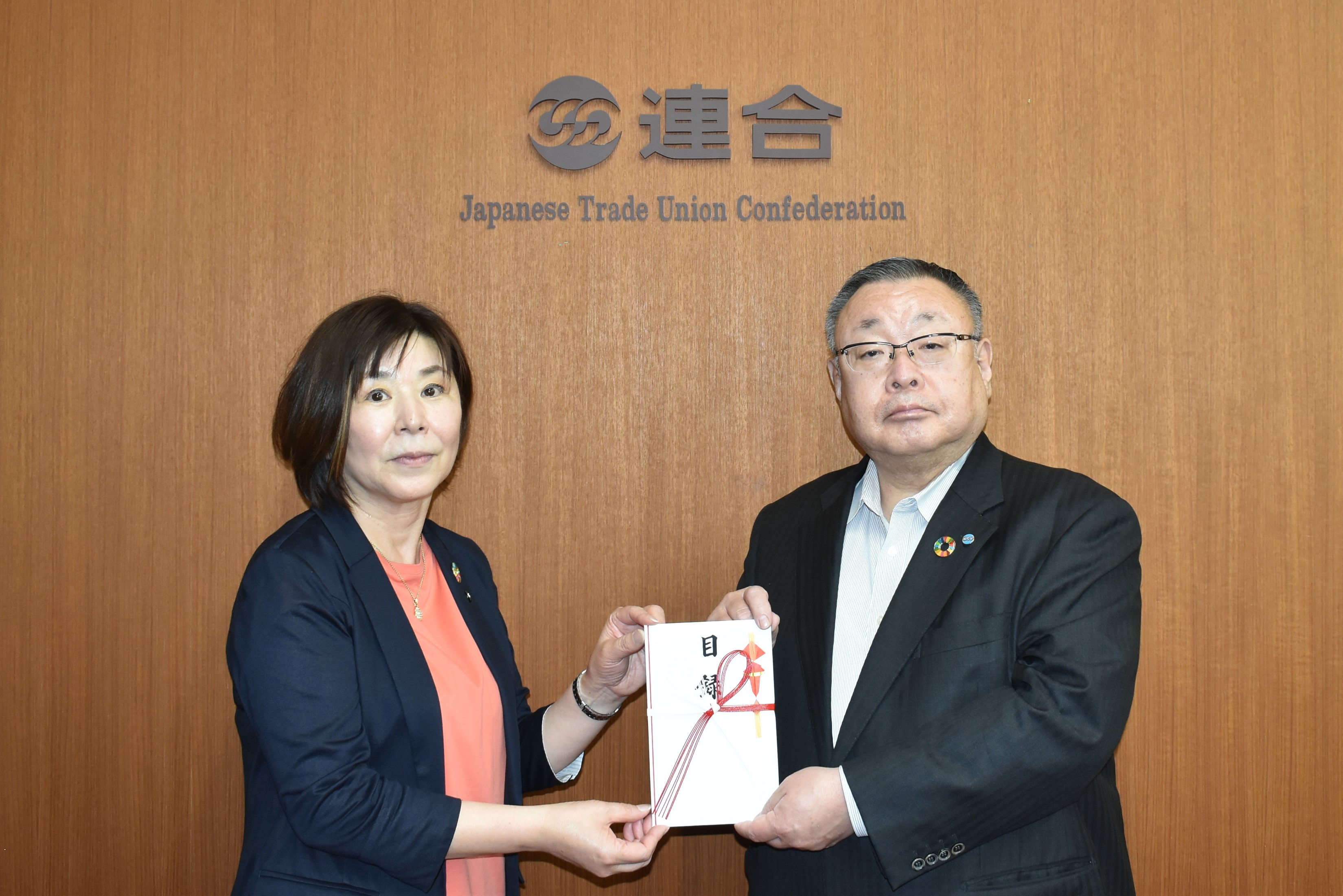 中央労福協は5月17日、第94回メーデー中央大会でブース出店し販売した福島県産ブランド米の売上金のうち、15万1千円を連合トルコ・シリア地震救援カンパへ寄付することとし、目録を中央労福協・南部事務局長から連合・清水事務局長にお渡ししました。カンパ金は今後、トルコ・シリアで困窮されている多くの難民・避難者の救援に役立てられます。