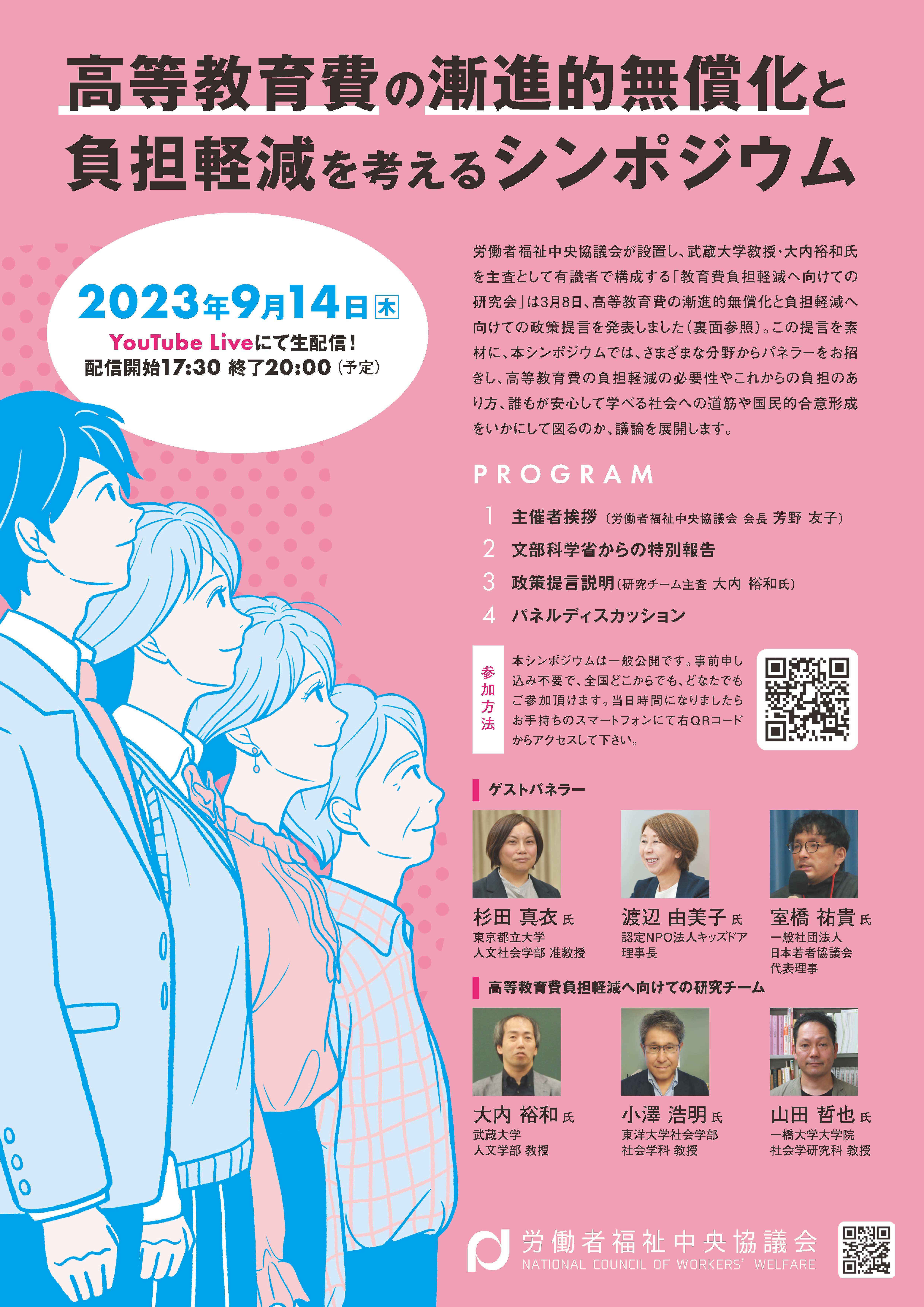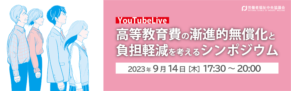 中央労福協の研究チームが発表した「高等教育費の漸進的無償化と負担軽減へ向けての政策提言」を素材として、負担軽減の必要性や、これからの負担のあり方、誰もが安心して学べる社会への道筋や国民的合意形成をどうつくるかを考えるシンポジウムを開催します。
